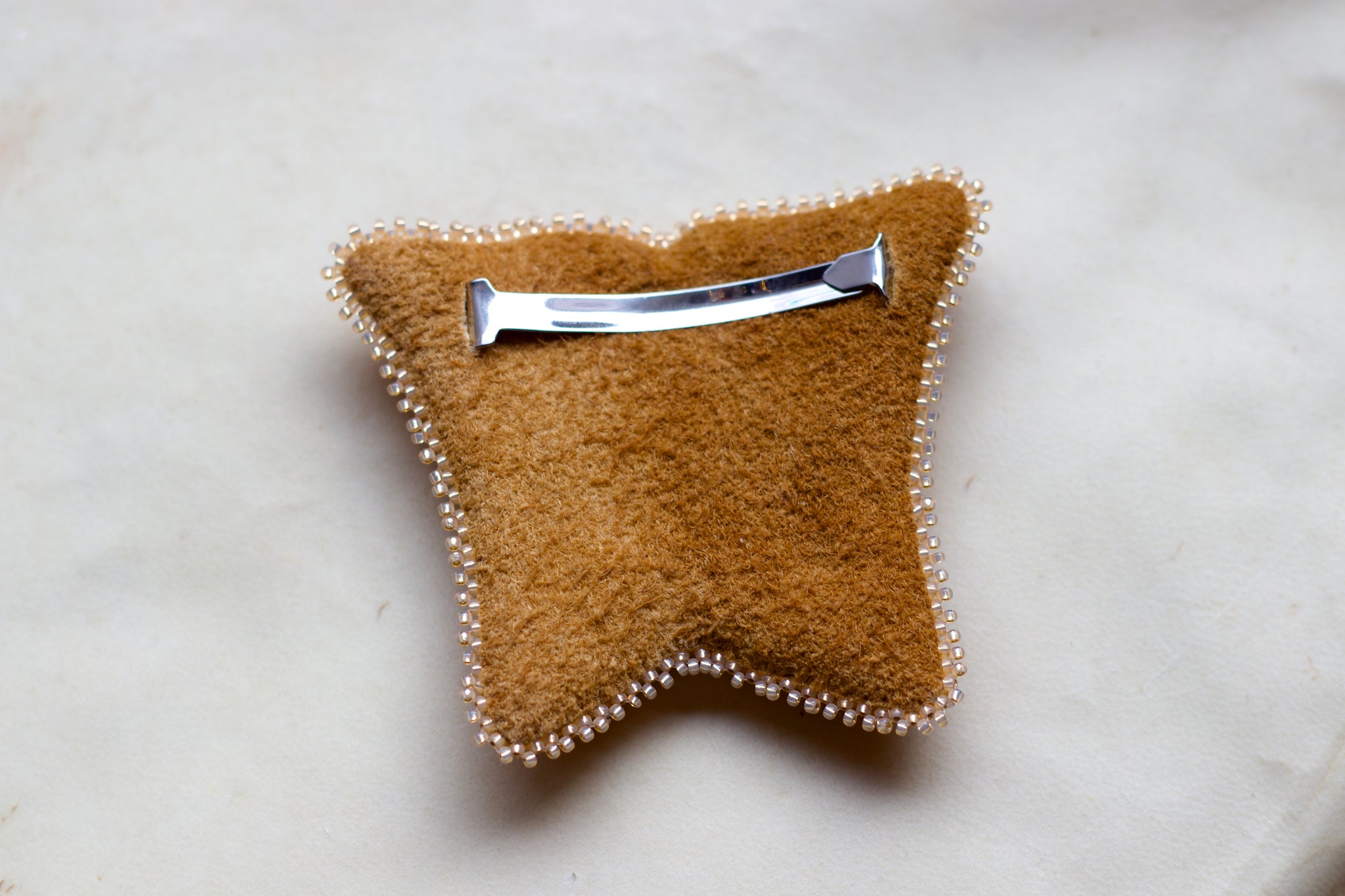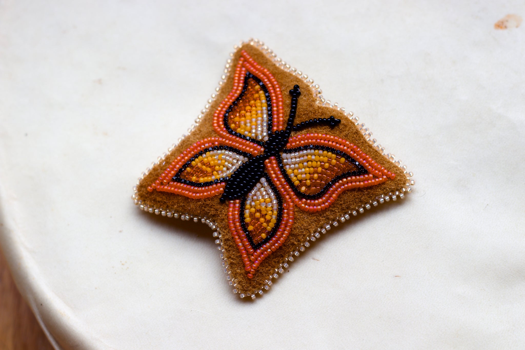 Beaded on brain tanned moose hide. Sheen cut beads.